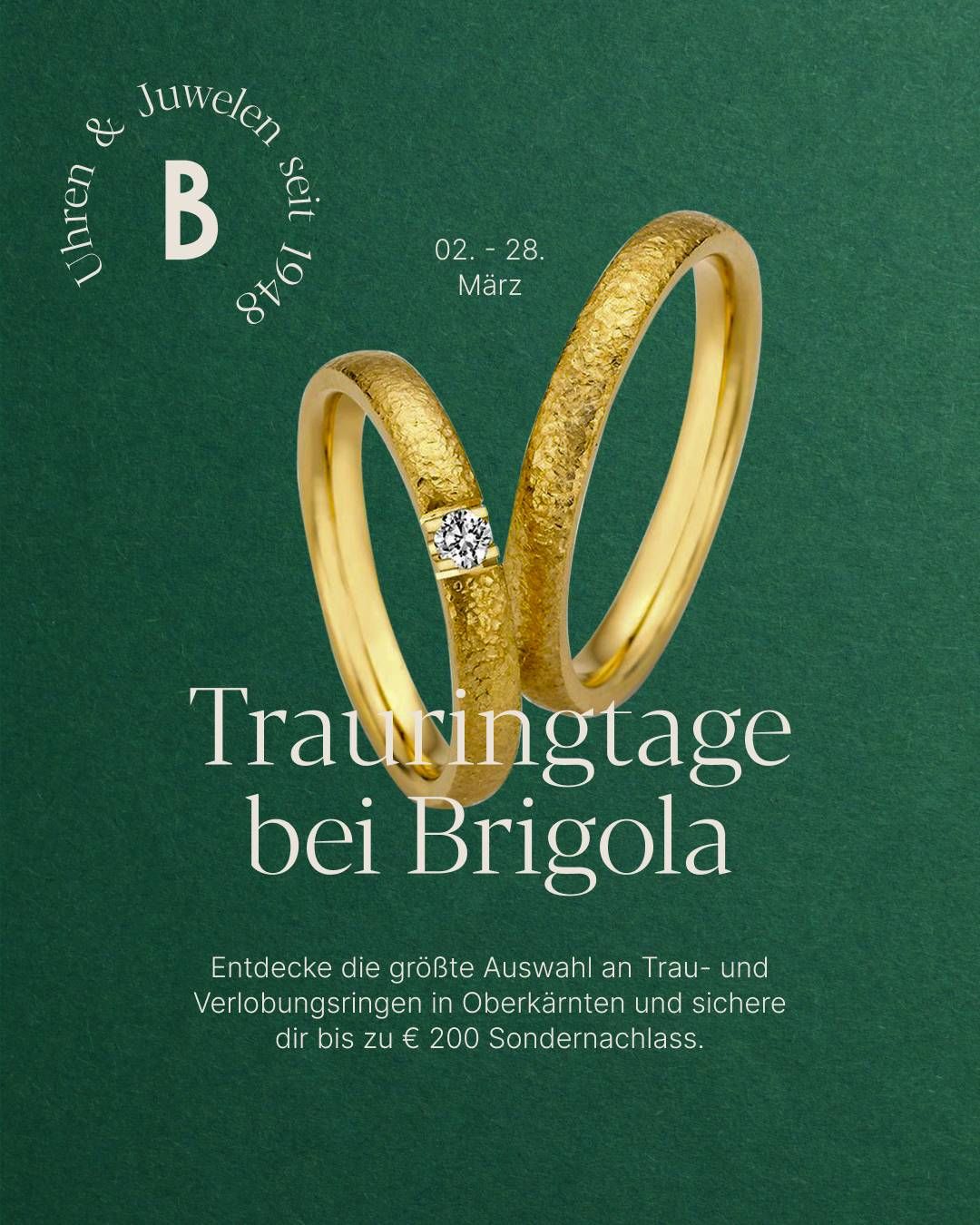 Sichert euch € 200,00* Sondernachlass auf Trauringe oder einen € 100,00** Gutschein beim Kauf eines Verlobungsrings. Zusätzlich bieten wir kostenlose Gravuren sowie die größte Auswahl in Oberkärnten. Gerne beraten wir euch dazu bei Kaffee & Prosecco in gemütlicher Atmosphäre.